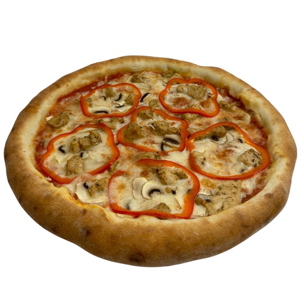 Печериці,фета,куряча грудка,кукурудза,томати,моцарелла,вершково-сирний соус,часникове масло,орегано(0.550г)